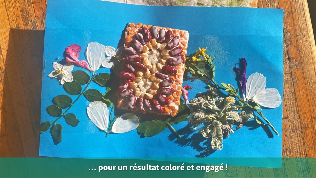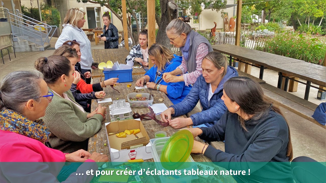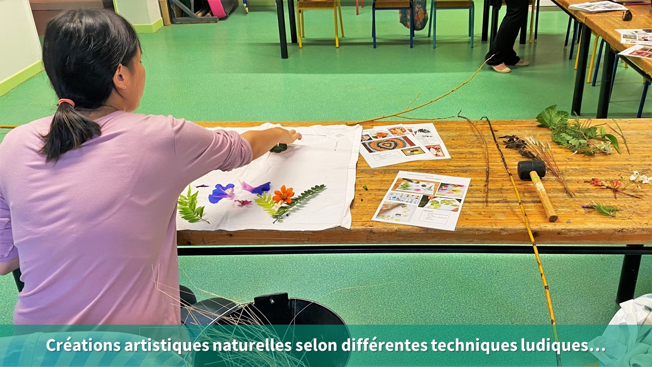 - Durant la journée d’accueil des centres spécialisés, l’atelier « créations nature » a été organisé pour initier les éducateurs présents aux créations nature. Ils ont pu découvrir l’importance du temps à accorder pour une bonne collecte et les différentes techniques ludiques pour magnifier leurs trouvailles (pinceau nature, empreinte végétale…).