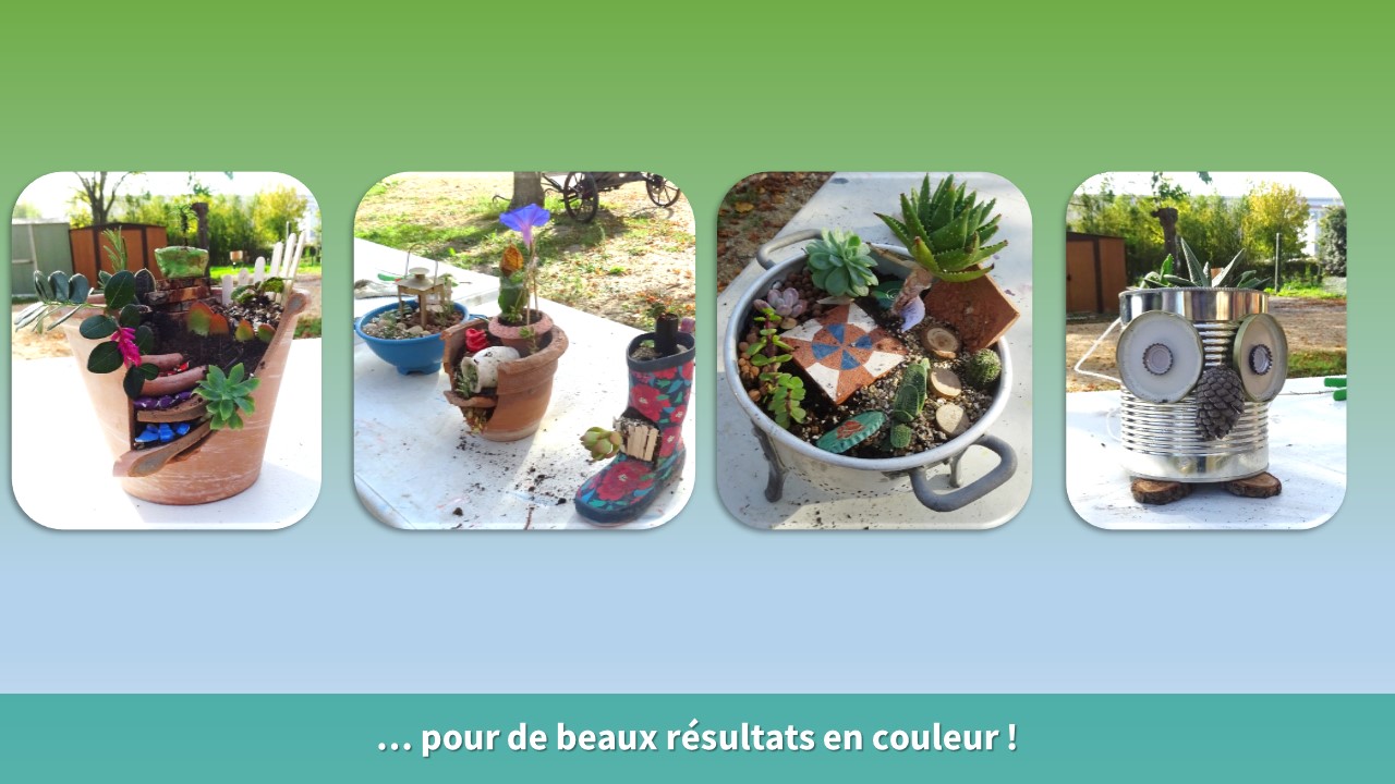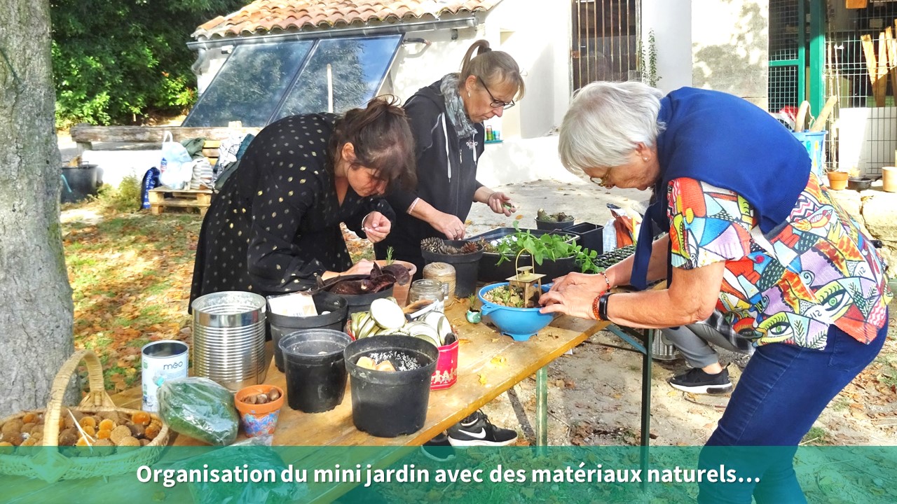 - Lors de l’atelier « jardins miniatures insolites » les participants ont pu acquérir des connaissances sur le jardinage, en s’informant sur les plantes choisies et sur leur mise en terre, tout en exprimant leur créativité, au travers d’un contenant original (boite de conserve, botte de pluie, tasse à café, passoire…).