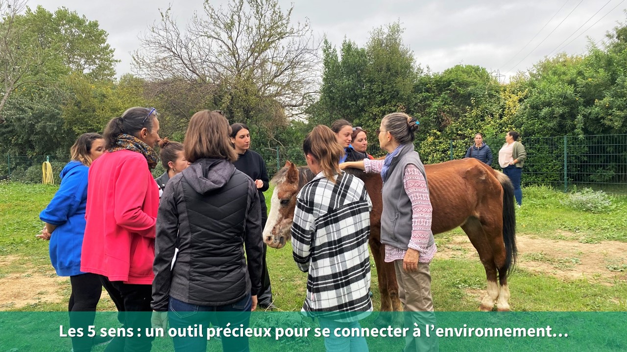 - Lors d’une visite attentive du domaine, les participants à l’atelier « découvertes sensorielles » ont pu prendre le temps de se reconnecter au milieu environnant via leurs 5 sens grâce à différentes activités ludiques stimulantes.
